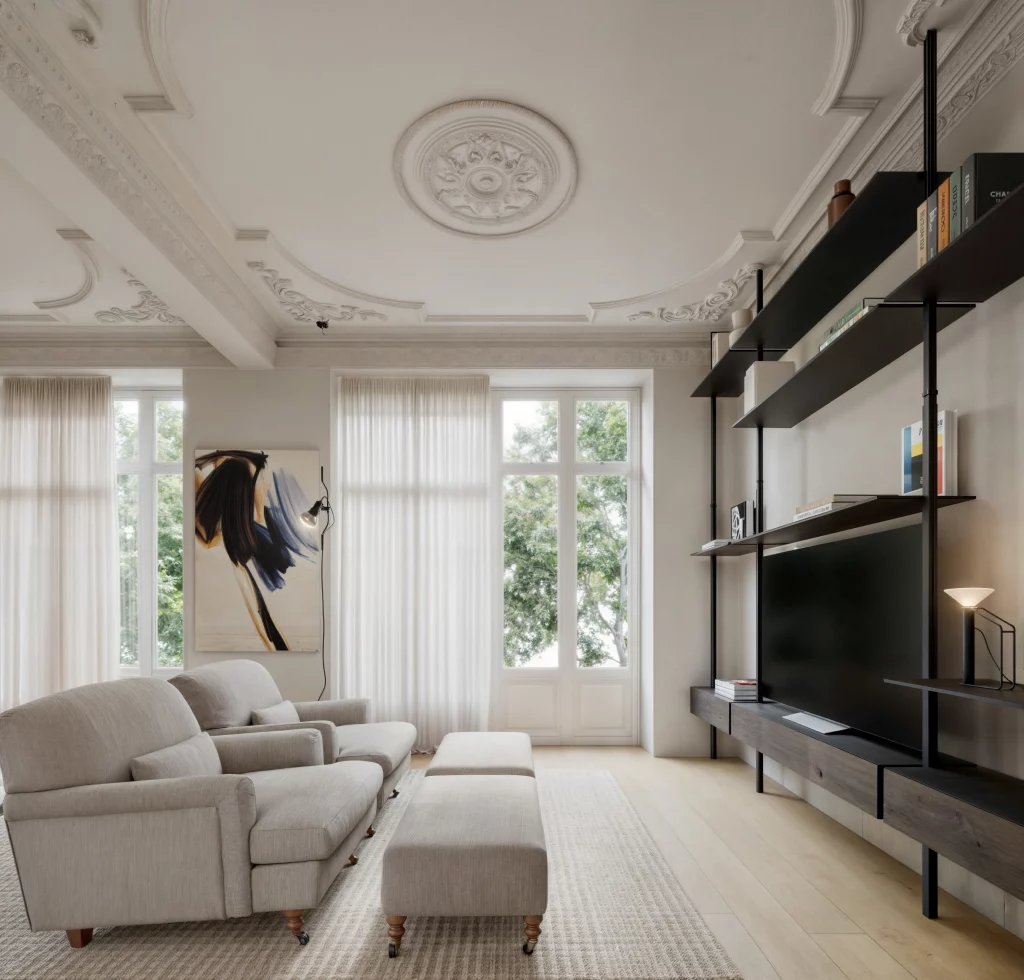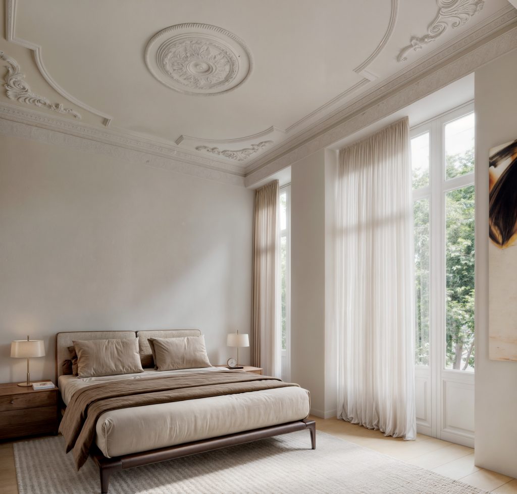 La zona de día se organiza en torno al salón y la cocina, que se abren a un patio interior convertido en un pequeño jardín: una auténtica joya en el centro urbano. La arquitectura juega aquí con volúmenes, alturas y planos que dialogan entre lo clásico y lo contemporáneo: cornisas y molduras históricas conviven con una cristalera arquitectónica que conecta interior y exterior con naturalidad.