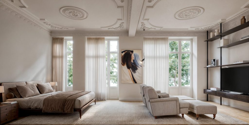 Al entrar, el dormitorio principal se descubre como un refugio en sí mismo, con su vestidor, su baño en suite y una acogedora zona de lectura frente a las copas de los árboles de la avenida. Una atmósfera que recuerda a la calidez de una suite de hotel, pero con la libertad de estar en casa.