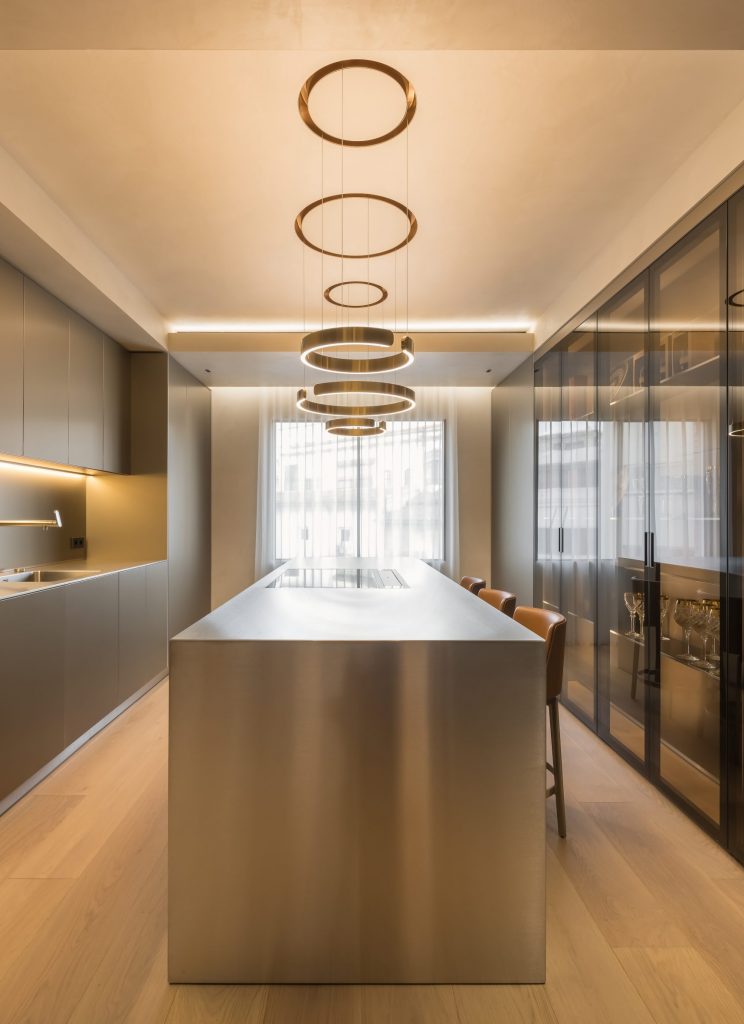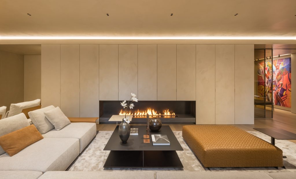 El espacio —organizado como un gran loft con zonas bien diferenciadas— gira en torno a una amplia zona de día que integra salón, comedor, despacho y cocina, con un sofá a doble cara que marca el ritmo del estar. La chimenea ocupa el centro con sobriedad, como punto de reunión y recogimiento. La cocina, ejecutada íntegramente en acero, transmite una elegancia silenciosa y decidida. La zona de noche se completa con un dormitorio principal con vestidor y baño, y una segunda suite de invitados, todo resuelto con la misma coherencia estética.