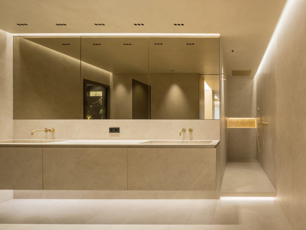 En este hogar, la estética no es un añadido: es el eje rector. Cada acabado, cada textura, cada mueble ha sido escogido con los clientes tras un proceso minucioso, en el que primó siempre la belleza, la proporción y el lenguaje de los materiales por encima de cualquier otra consideración. El cuero natural actúa como hilo conductor, acompañado de estucos aplicados a mano que dotan a las superficies de profundidad y carácter.