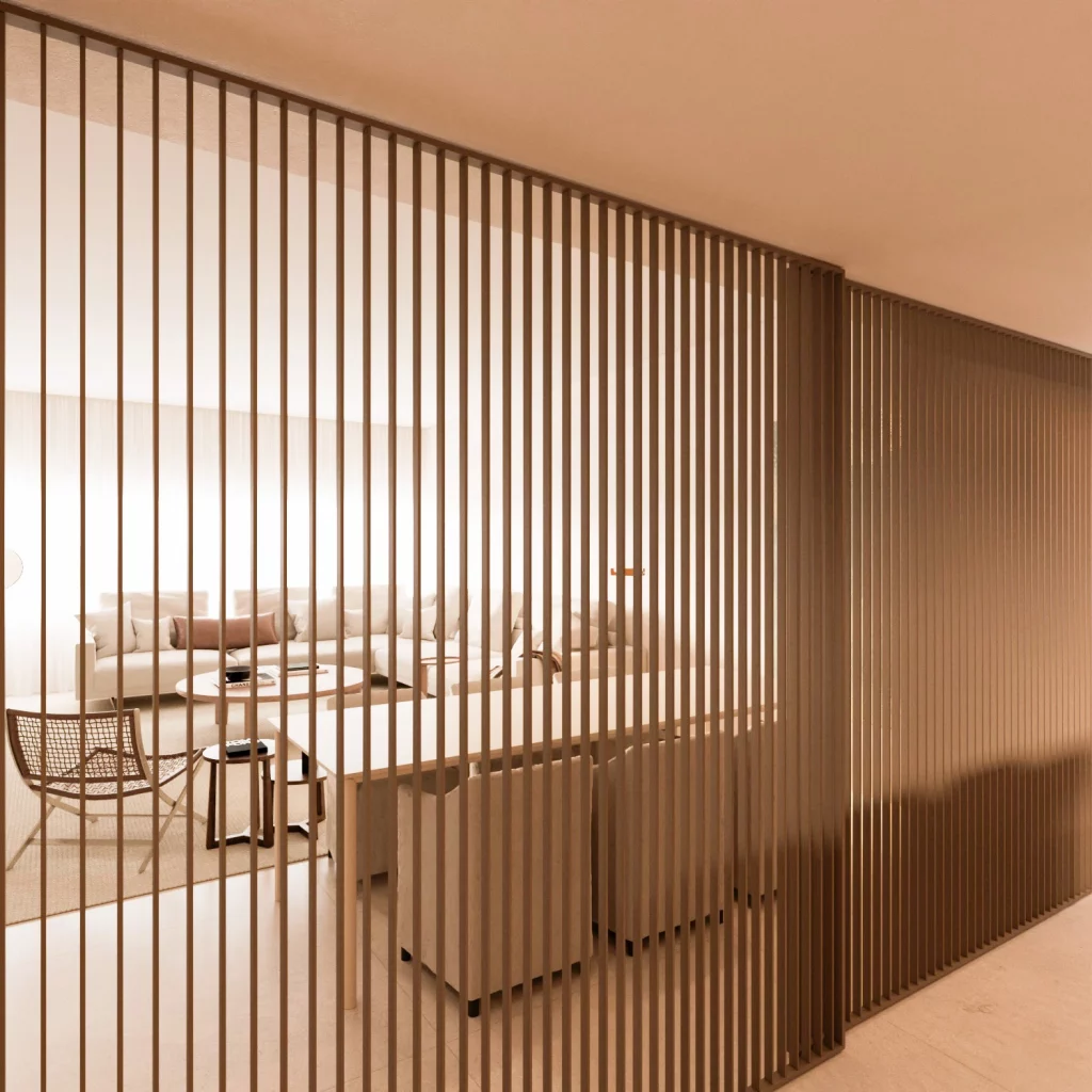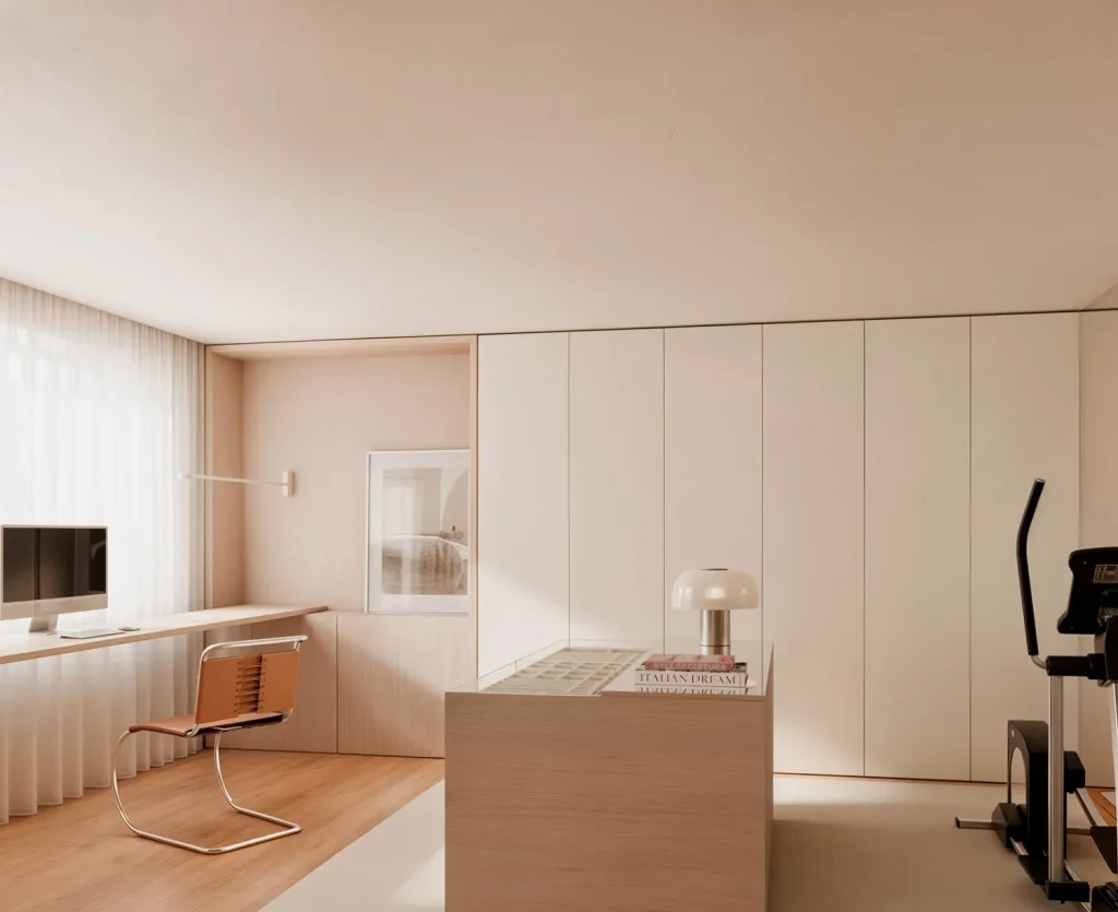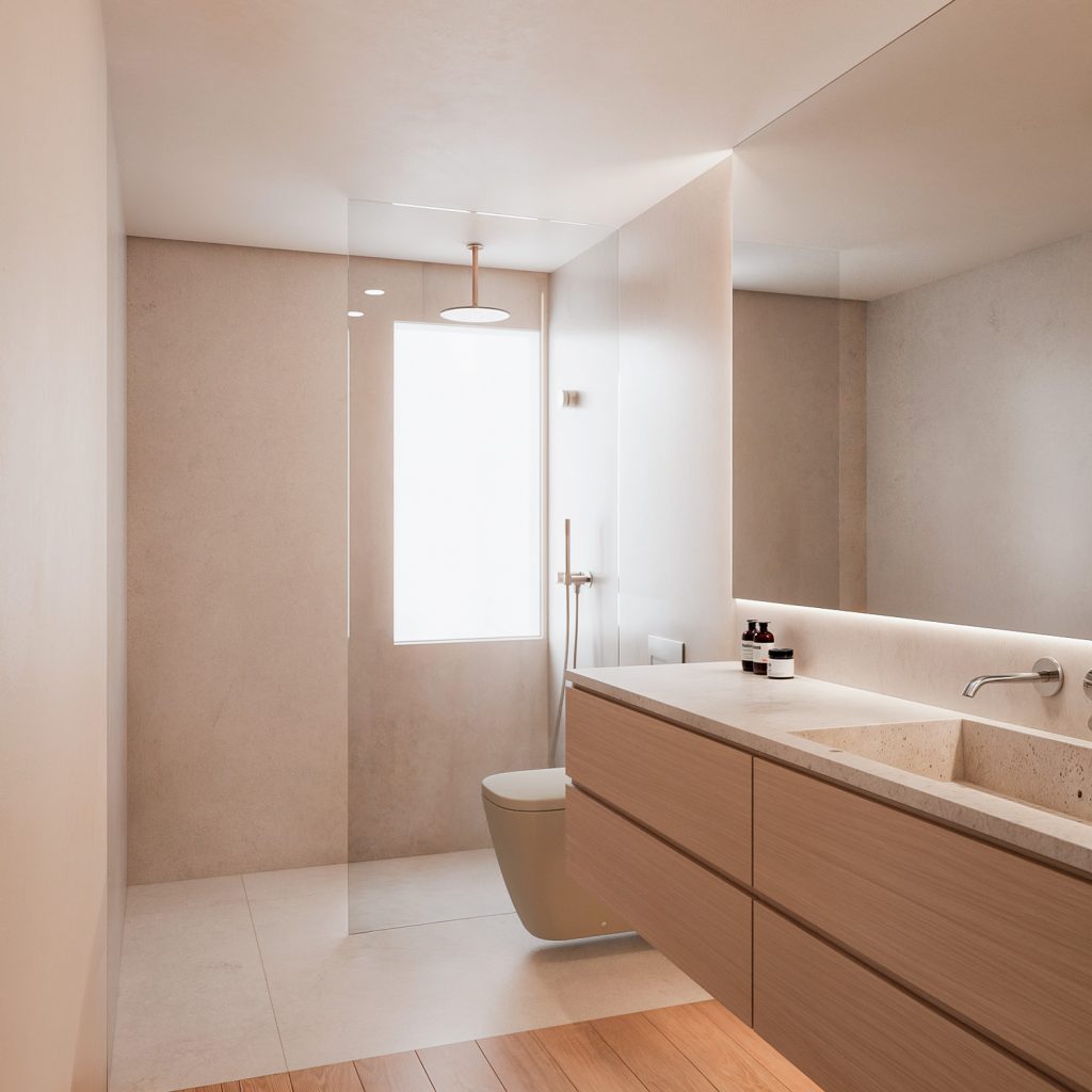 El contraste de materiales ayuda a ordenar la vivienda: piedra natural en las zonas comunes, que aporta presencia y altura, y madera cálida en las estancias privadas, generando confort y recogimiento. El dormitorio principal, concebido como una suite, incorpora vestidor, zona de estudio y un pequeño gimnasio doméstico, en un solo gesto envolvente que multiplica la sensación de espacio.