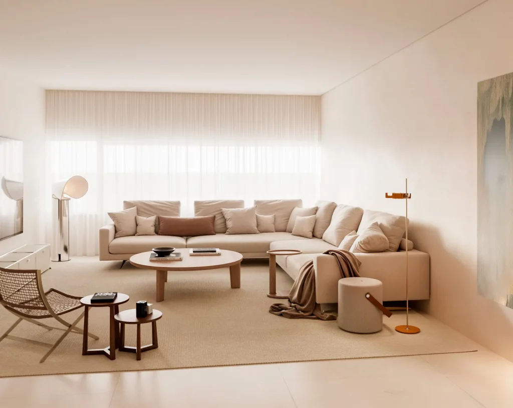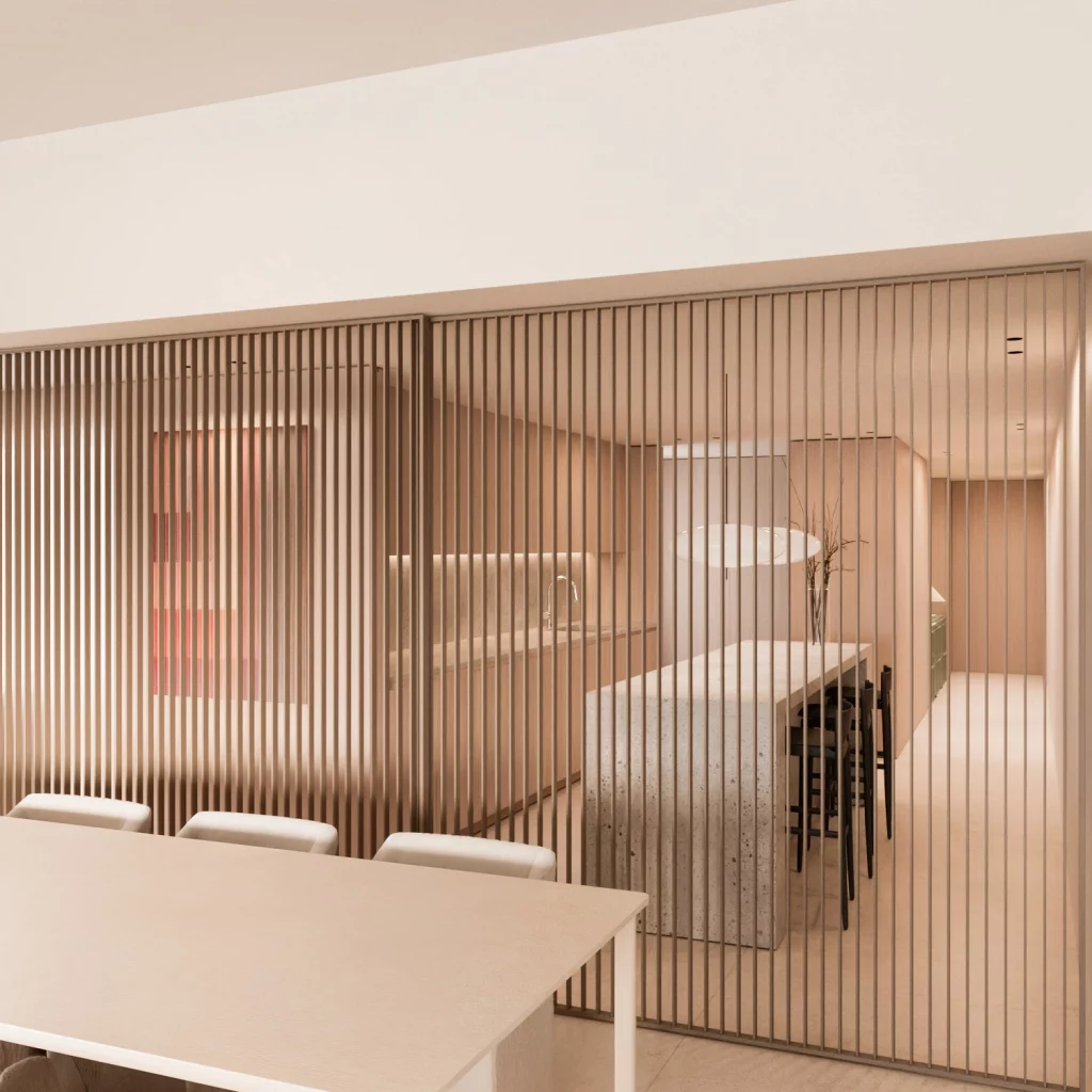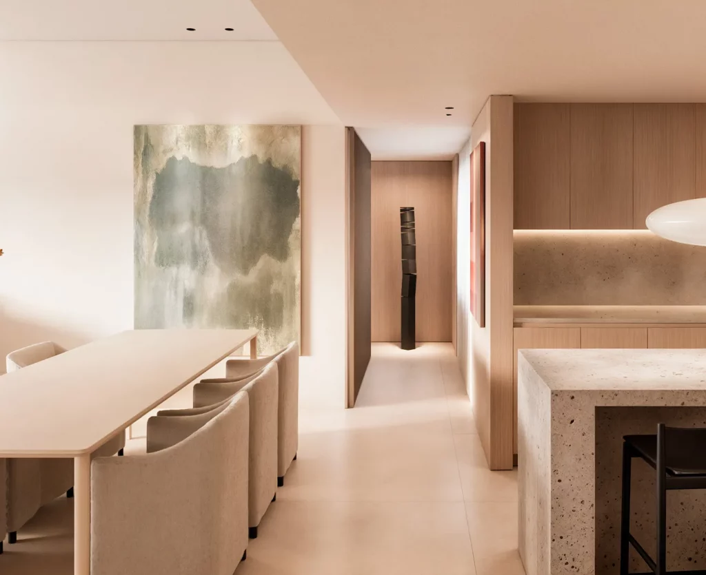 La cocina, abierta a la zona de estar, articula uno de los gestos más relevantes del proyecto. Se ha diseñado como un espacio en dos tiempos: por un lado, una isla escultórica, limpia y funcional, que dialoga con el comedor y la sala en un mismo lenguaje; por otro, una zona técnica cuidadosamente resuelta —con electrodomésticos, zona de cocción y aguas— que queda oculta tras una corredera integrada. Esta solución permite vivir la cocina de forma abierta, compartida y cotidiana, pero también ofrecer privacidad y orden cuando es necesario.