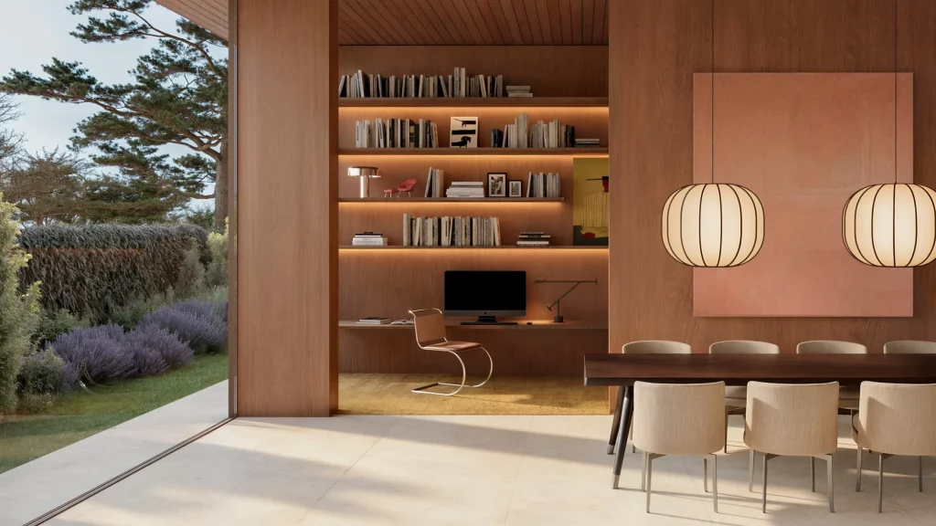 La estética de la vivienda respira un aire sofisticado y singular, con referencias a la arquitectura estadounidense de los años 50, reinterpretadas desde una mirada contemporánea y refinada. Una mezcla de épocas y estilos que conviven con naturalidad, aportando peso, bagaje y una fuerza visual inconfundible.