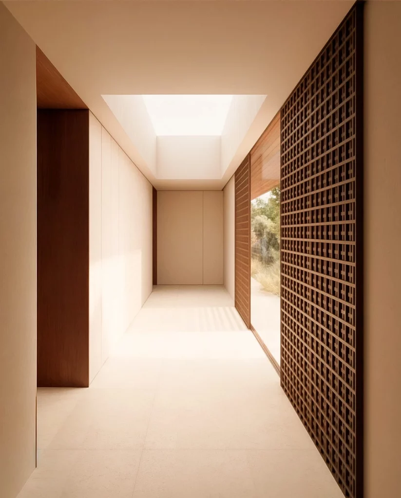 La interrelación entre interior y exterior se convierte en protagonista gracias a ventanales, claraboyas y celosías de madera que permiten la entrada de luz y vegetación, creando un juego de texturas y sombras cambiante a lo largo del día. Cada espacio se ha concebido para adaptarse con comodidad a las distintas formas de habitar: desde la intimidad de la vida familiar hasta los momentos de encuentro.