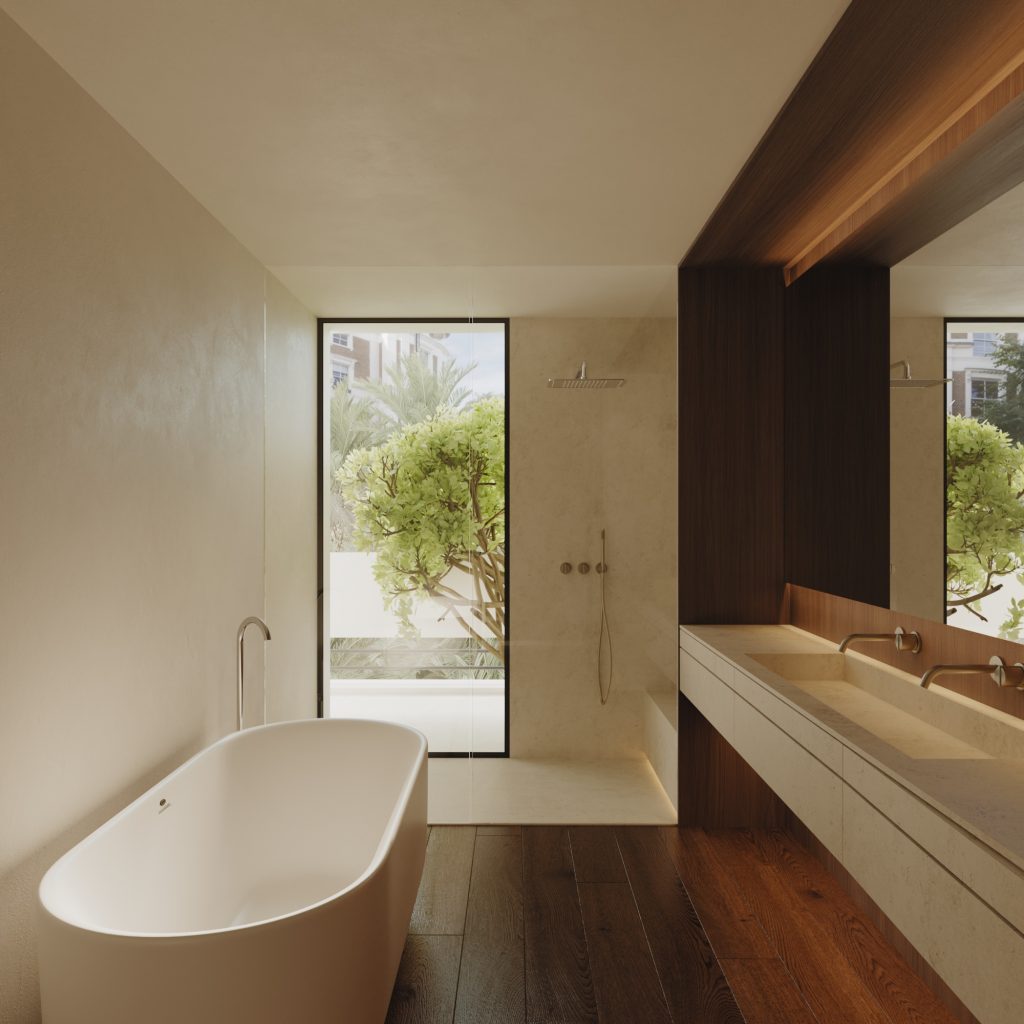 En la zona de noche, los materiales cambian de lugar: la madera pasa al suelo y los lacados suben por las paredes, generando una transición serena. El dormitorio principal se proyecta como una suite envolvente con zona de tocador y un baño revestido también en madera, coronado por una bañera exenta orientada hacia la luz. El dormitorio de la hija combina nogal y fresno blanqueado en un ambiente más fresco,