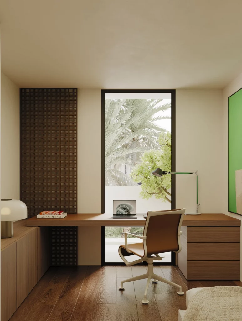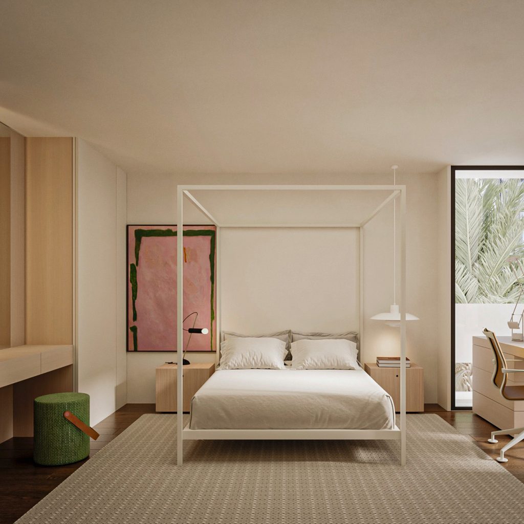con una zona de estudio integrada. Y al otro lado de la vivienda, un dormitorio de invitados y un despacho completan el programa, aportando versatilidad y carácter.