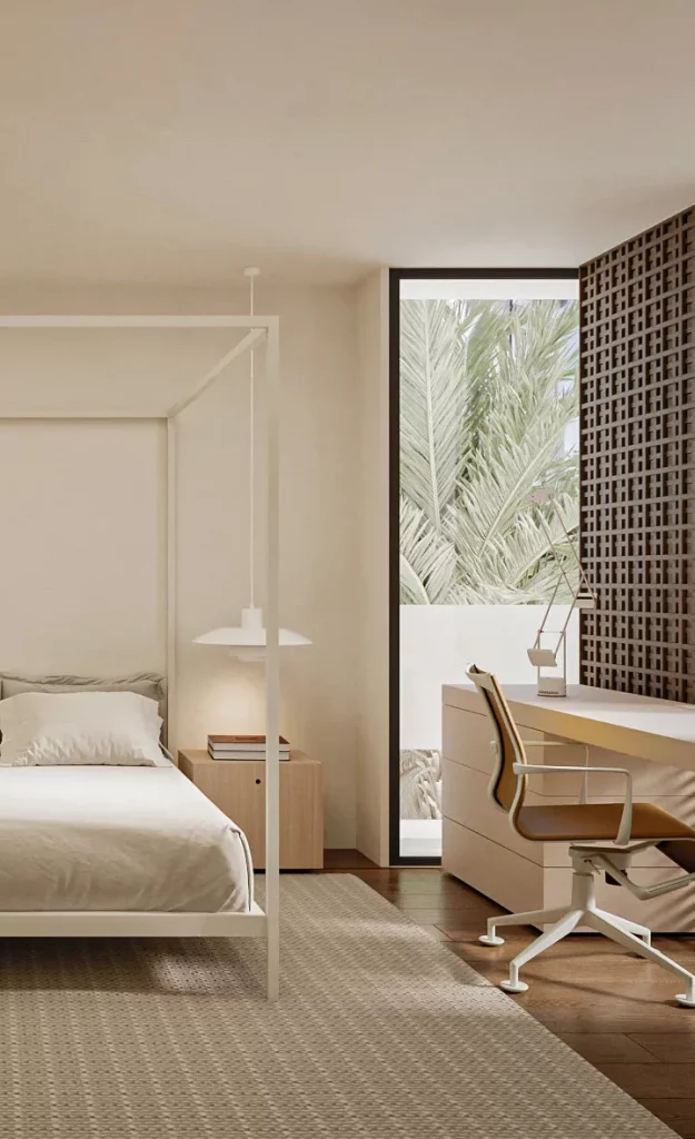 La zona de día articula el corazón de la casa. Dos grandes correderas permiten unir o dividir el salón principal y la sala de televisión. Abiertas, crean un único espacio de amplitud casi escenográfica; cerradas, dan lugar a ambientes recogidos y funcionales. Aquí, el mobiliario adquiere un protagonismo indiscutible: dos sofás Camelot de Flexform definen la zona de estar, mientras que el comedor —con piezas de dePadova y butacas— dialoga con una arquitectura que busca siempre el equilibrio entre materia y atmósfera. La selección se completa con piezas icónicas del diseño internacional, cuidadosamente elegidas para acompañar la escala de la vivienda sin imponerse.